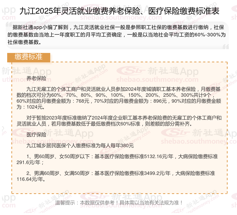 以上就是带来九江灵活就业社保缴费标准相关知识,内容及数据仅供参考,希望对你有帮助,欢迎关注/下载新社通app解锁更多社保专业资讯。