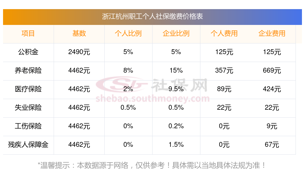 2025年浙江杭州社保缴费多少钱?下表是2024-2025年浙江杭州社保费用明细参考,新社通app-社保缴费查询工具提供的最新数据如下: