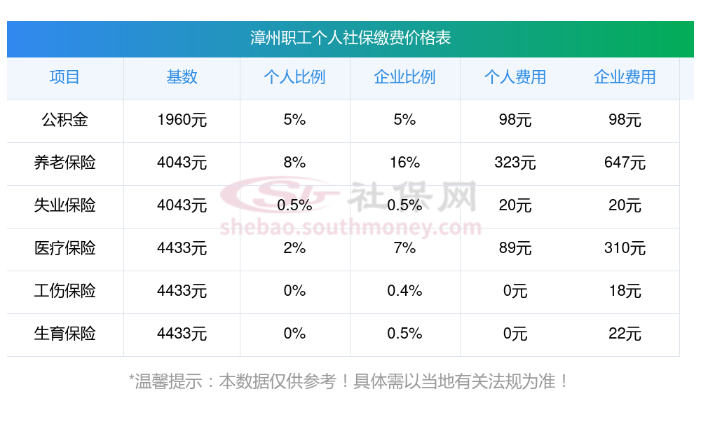 一、据新社通app获悉:漳州企业职工社保缴费基数为:3579.00元,漳州社保缴费标准基数及比例2025年个人社保缴费标准表(最低标准)?: