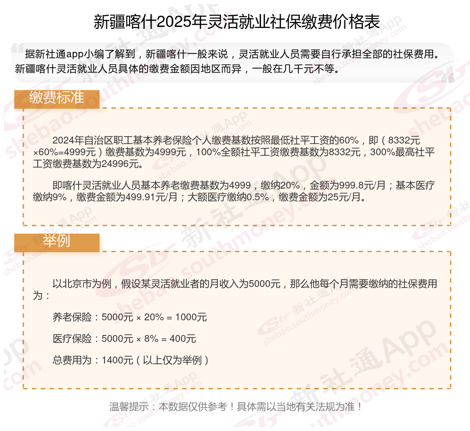 即喀什灵活就业人员基本养老缴费基数为4999,缴纳20%,金额为999.8元/月;基本医疗缴纳9%,缴费金额为499.91元/月;大额医疗缴纳0.5%,缴费金额为25元/月。