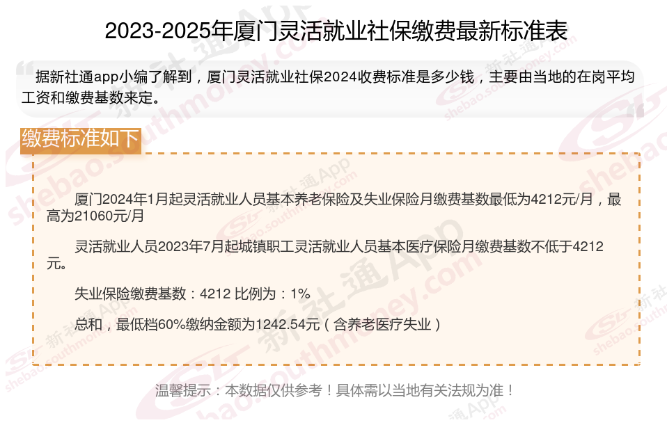 据新社通app数据显示,2024-2025年厦门灵活就业人员养老保险的缴费标准: