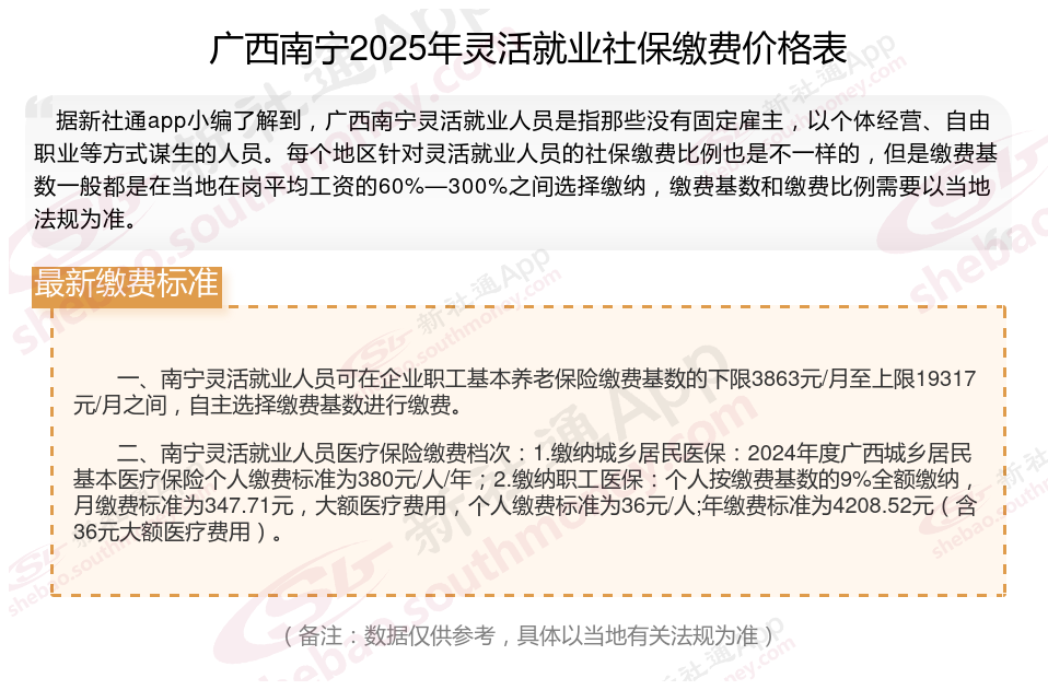 那么,广西南宁灵活就业人员社保缴费标准2024-2025最新来了,交社保有什么好处?根据新社通app-社保缴费查询工具提供的2025社保缴费标准详情数据: