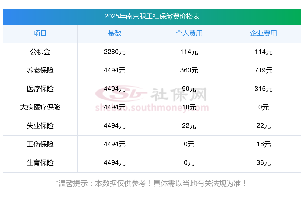 据新社通app小编了解到,2025年南京社保缴费基数参照为3579.00,南京社保缴费明细如下:
