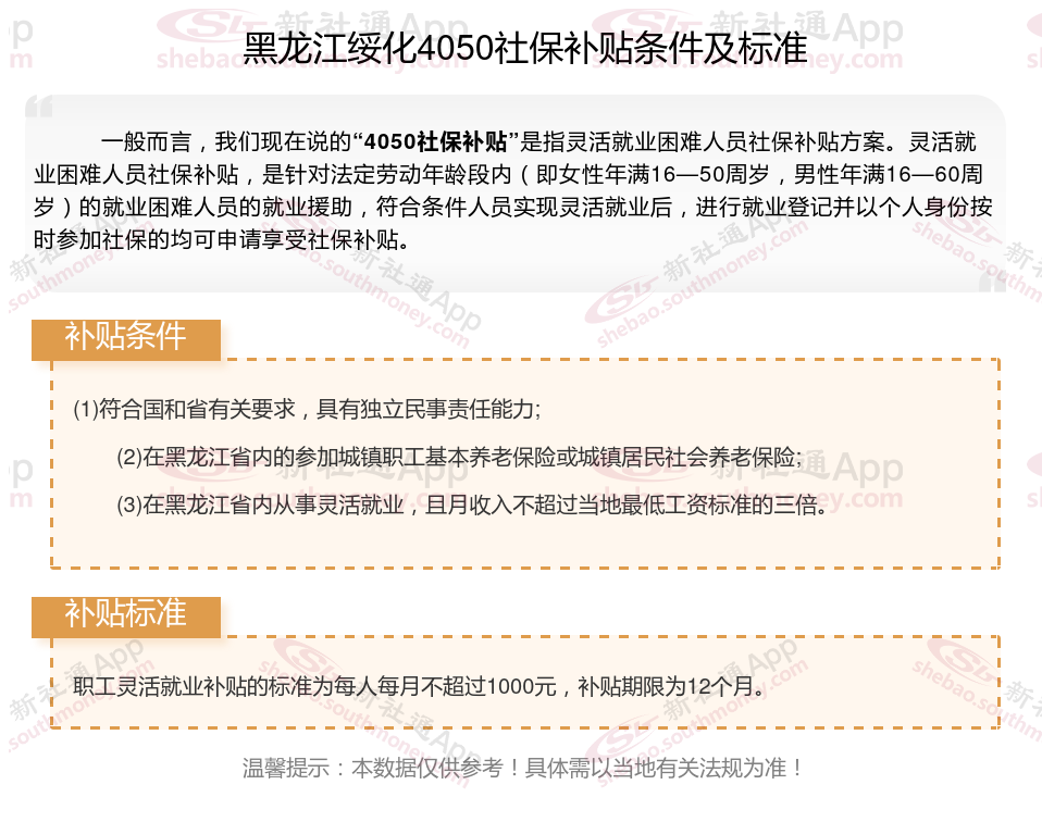 4050补贴主要是针对大龄就业困难人群的社保补贴,申请条件包括年龄、就业困难、灵活就业并自费缴纳社保,需要持有失业登记证,不同地区可能有细微差别,比如农村户口的限制。那么黑龙江绥化4050灵活就业社保补贴标准是多少钱?黑龙江绥化4050社保补贴条件是什么?接下来随新社通APP小编了解一下最新资讯。