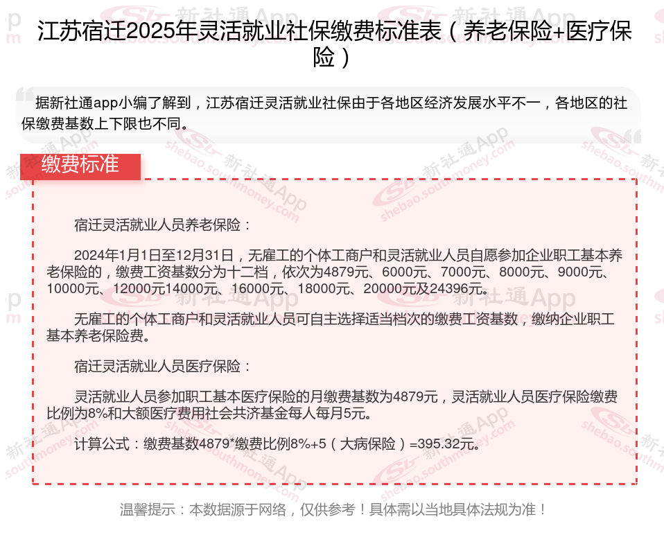 据新社通app数据显示,2024-2025年江苏宿迁灵活就业人员养老保险的缴费标准是根据缴费基数来确定的: