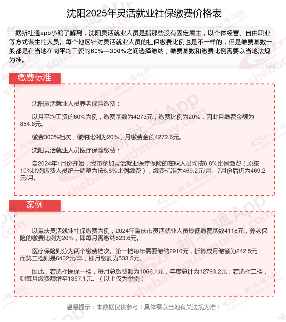 2024-2025年沈阳灵活就业人员社保缴费标准是多少?社保交完退休能领多少钱?下表是2024-2025年沈阳社保费用明细参考,根据新社通app-社保缴费查询工具提供的最新数据如下:
