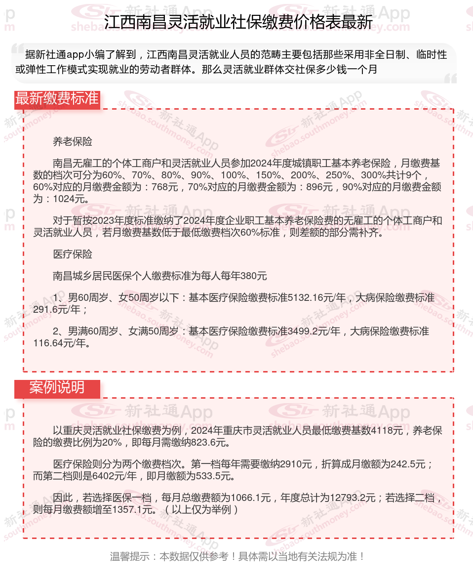 灵活就业人员自己交保险一个月多少钱?江西南昌自己社保缴纳金额是怎么计算?根据新社通app-社保缴费查询工具提供的最新数据如下:
