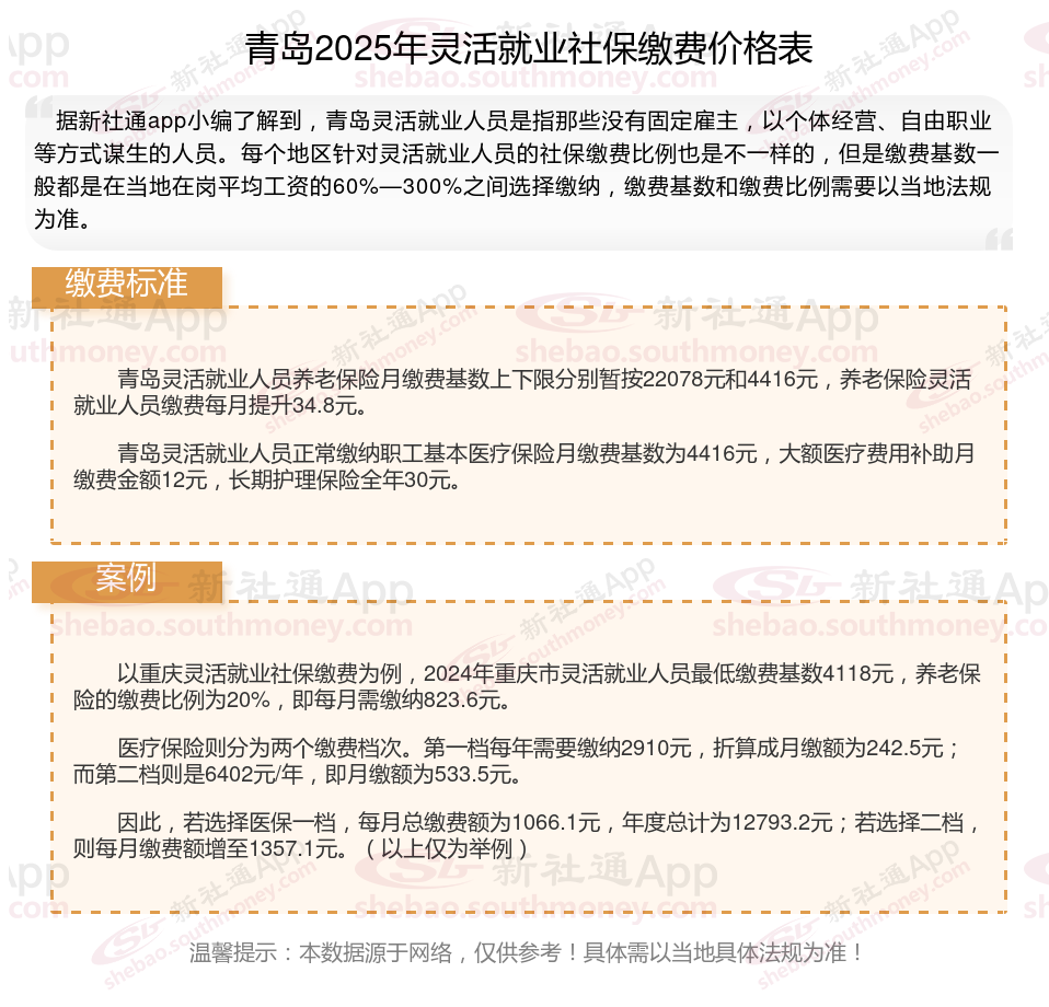 青岛灵活就业社保缴费标准来了 灵活就业人员保险一个月交多少钱?根据新社通app-社保缴费查询工具提供的最新数据如下: