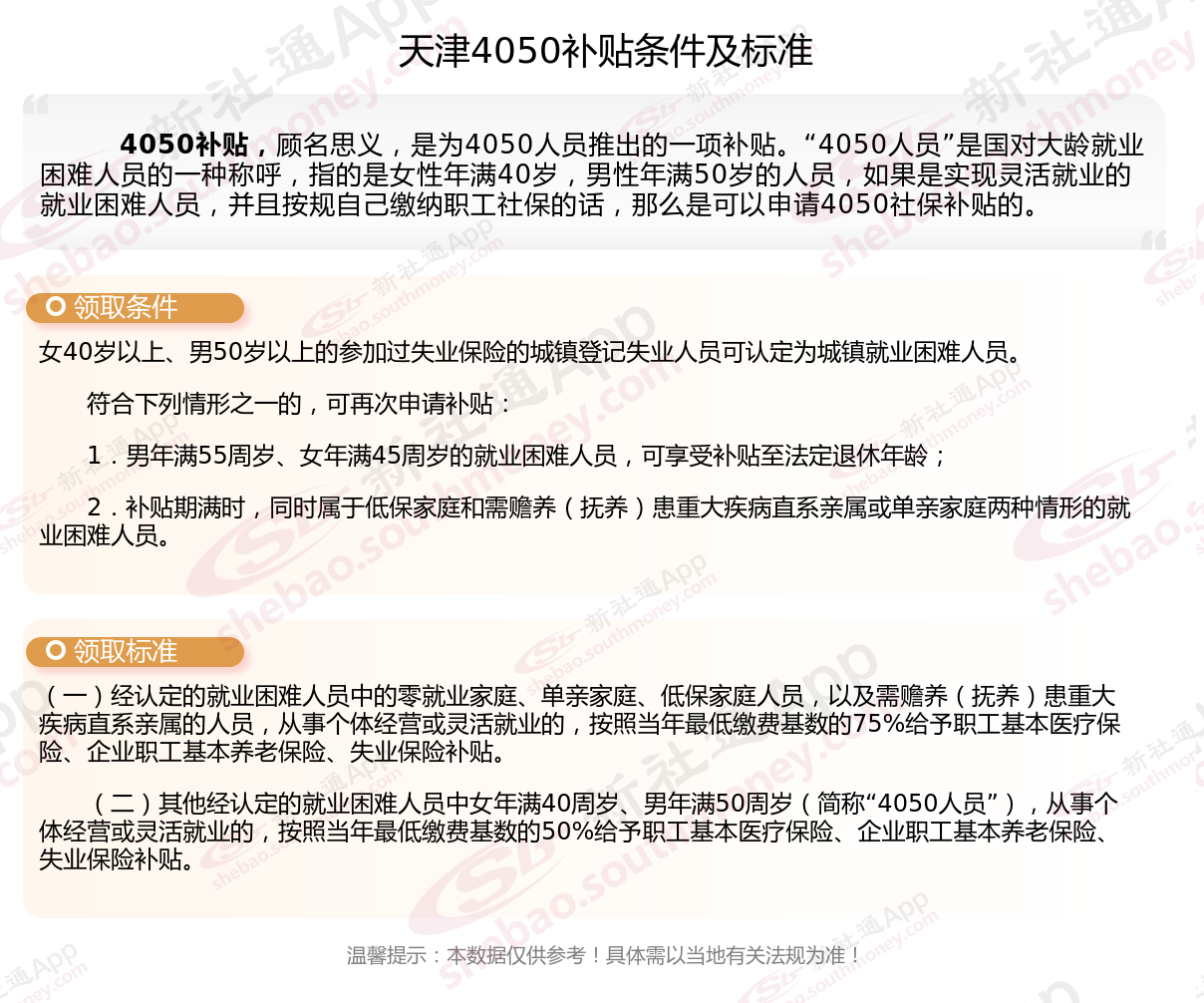 2025天津4050补贴主要针对的是年龄在40岁以上的女性和50岁以上的男性,这些人群通常因为年龄较大而面临就业困难。