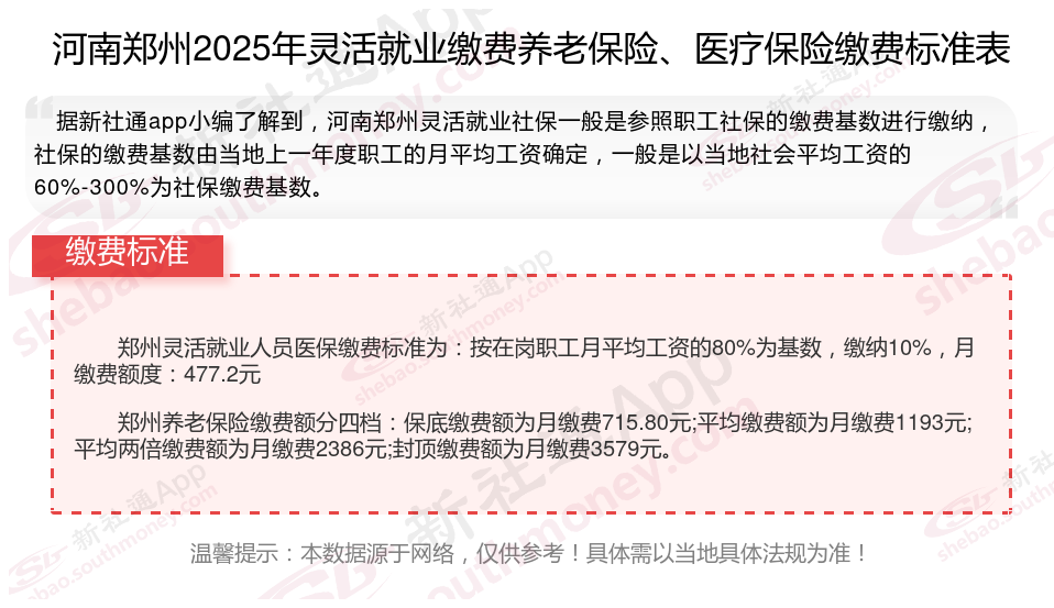 那么,河南郑州灵活就业人员社保缴费基数是多少?根据新社通app-社保缴费查询工具提供的2025社保缴费标准详情数据: