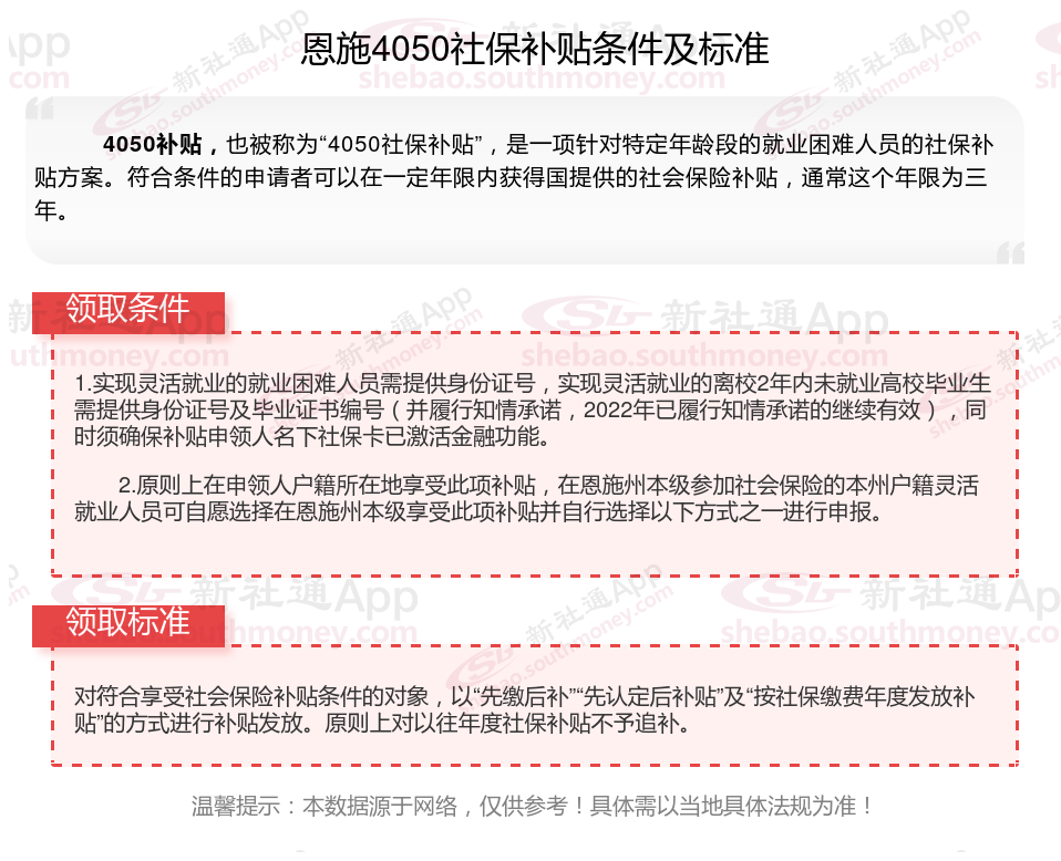 2025恩施4050补贴主要针对的是年龄在40岁以上的女性和50岁以上的男性,这些人群通常因为年龄较大而面临就业困难。
