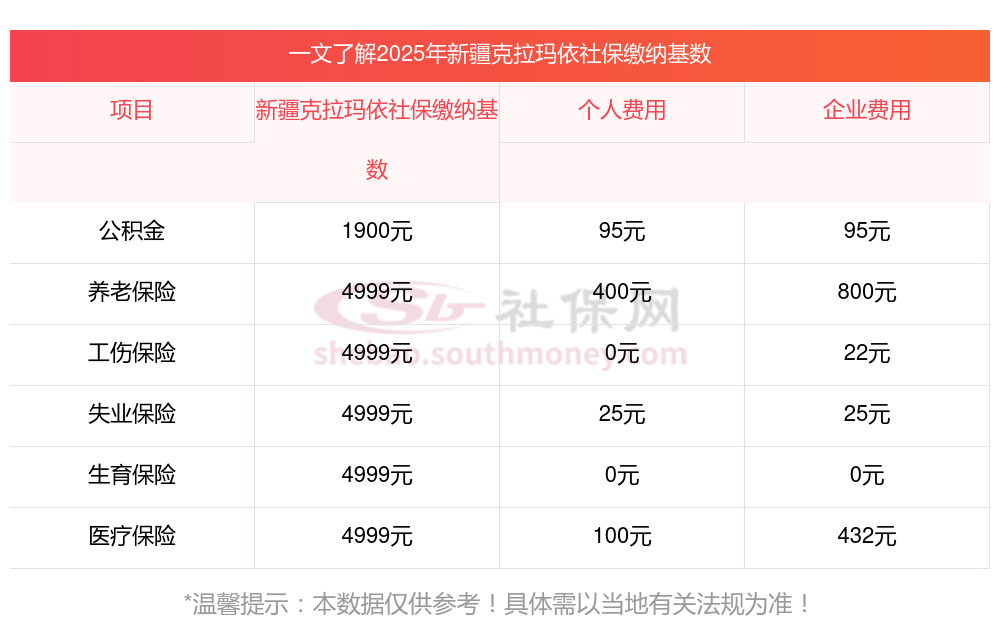 一、据新社通app-查阅了解到,用于计算社保费缴纳工资基数的社保基数,是按职工上一年度1月至12月全部工资性收入所得的月平均额来确定的。 目前该新疆克拉玛依社保的缴费基数为:4999.00,个人费用约为:399.92元,企业费用约为:799.84元。