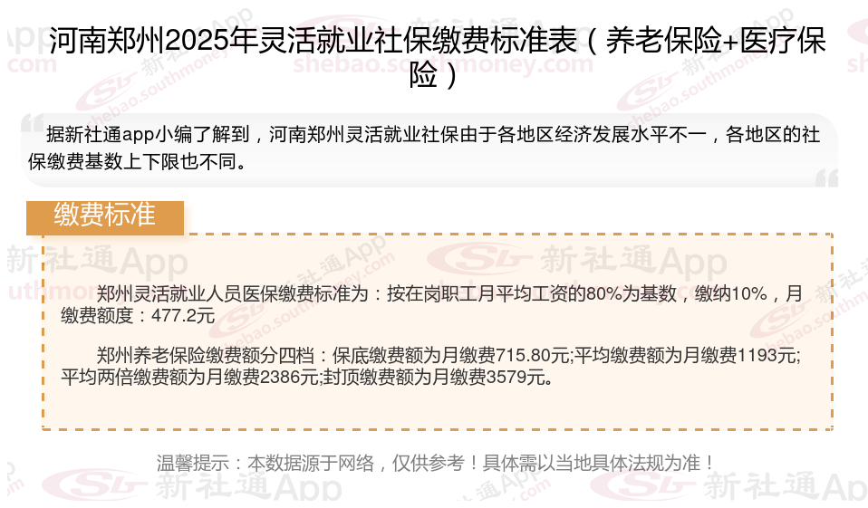 2025灵活就业社保缴费标准的调整,既体现了法规的连续性,又适应了经济社会发展的要求。灵活就业人员应根据自身情况,合理选择缴费基数和缴费比例,确保自身权益得到充分保证。接下来随社保君了解一下2025年河南郑州灵活就业人员社保交多少钱,2025年河南郑州灵活就业社保缴费标准的详细内容。