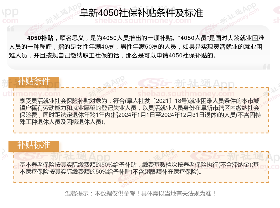 一、2025年阜新灵活就业4050社保补贴标准及条件是什么