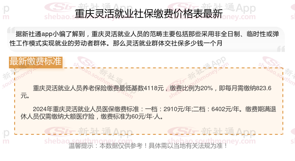 灵活就业社保能抵御疾病、失业、养老等重大风险,避免陷入经济困境。也能享受医保报销、养老金增长等红利。社保是劳动者的法定权利,断缴可能影响购房、落户、子女教育等。接下来随社保君了解一下2025年重庆灵活就业人员社保交多少钱,2025年重庆灵活就业社保缴费标准的详细内容。