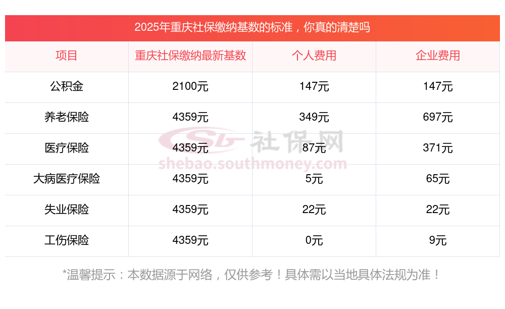 据新社通app-查阅了解到,职工上一年1月至12月期间所有工资性收入所得的月平均额,用来确定社保基数,该基数用于计算社会保险费缴纳的工资基数。 目前该重庆社保的缴费基数为:4359.00,个人费用约为:348.72元,企业费用约为:697.44元。