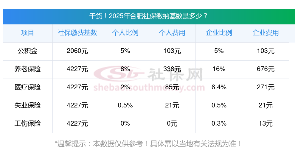 据新社通app-查阅了解到,社保基数的确定以职工上一年度1月至12月所有工资性收入所得的月平均额为基础,确定后的基数用于计算缴纳社会保险费的工资基数。 目前该合肥社保的缴费基数为:4227.00,个人费用约为:338.16元,企业费用约为:676.32元。