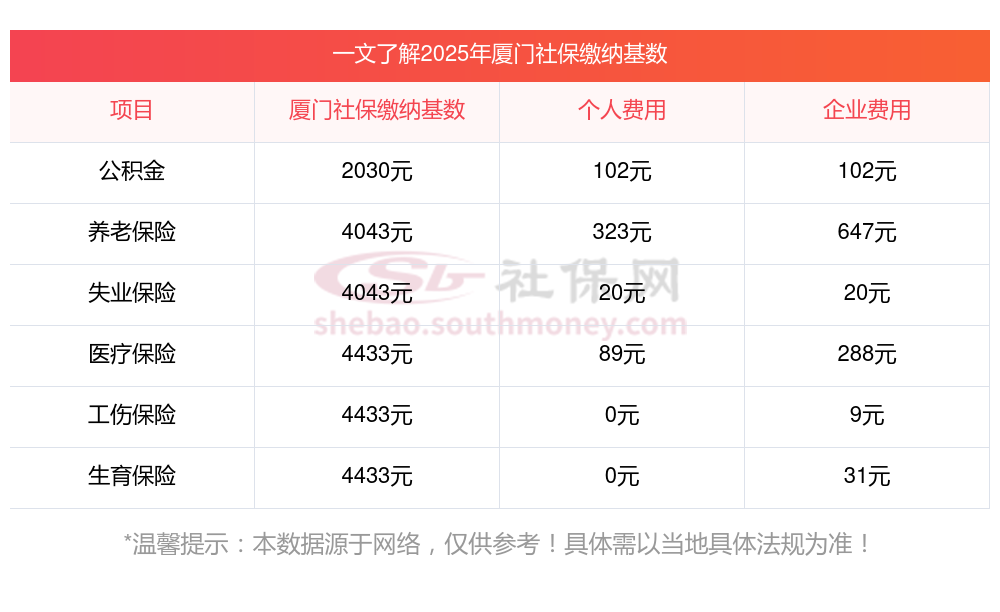 一、据新社通app-查阅了解到,职工上一年度1月至12月的所有工资性收入所得月平均额,用以确定社保基数,而社保基数用于计算缴纳社会保险费的工资基数。 目前该厦门社保的缴费基数为:4043.00,个人费用约为:323.44元,企业费用约为:646.88元。