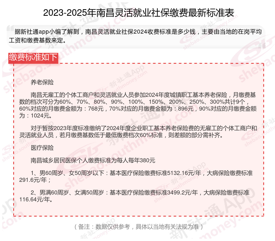 据新社通app数据显示,2024-2025年南昌灵活就业人员养老保险的缴费标准是根据缴费基数来确定的: