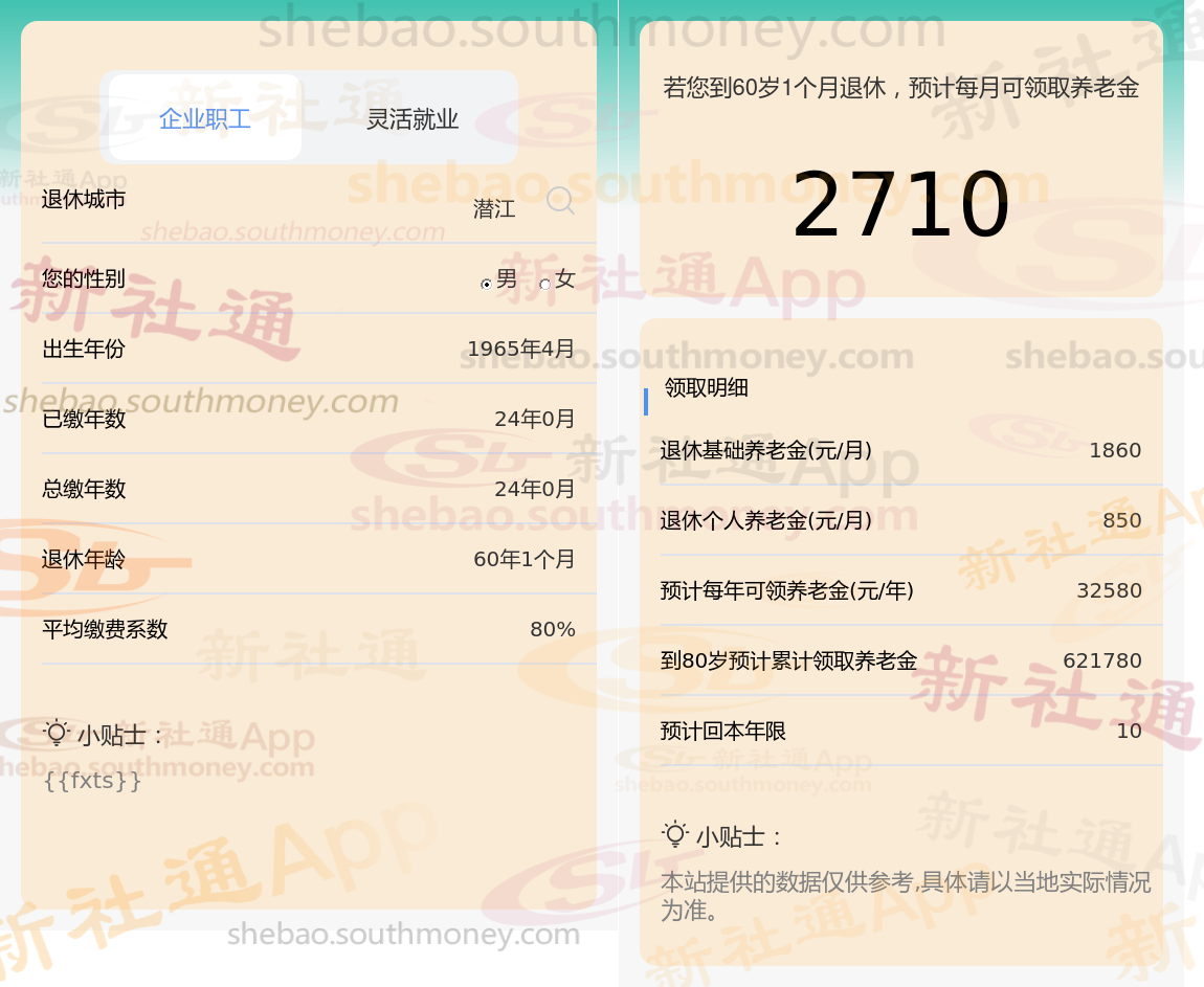 刘某,1965年出生于湖北潜江,是一位拥有24年社保缴费记录的退休职工,缴费档次为80%。辛勤工作多年后,他迎来了退休生活。通过新社通app养老金计算器计算所得,刘某得知自己每月可以领取到基础养老金约1860元,加上个人养老金约850元,总计2710元。虽然金额不算多,但对于刘某来说,这是一份稳定的收入来源,为他的退休生活增添了一份安心与保证。
