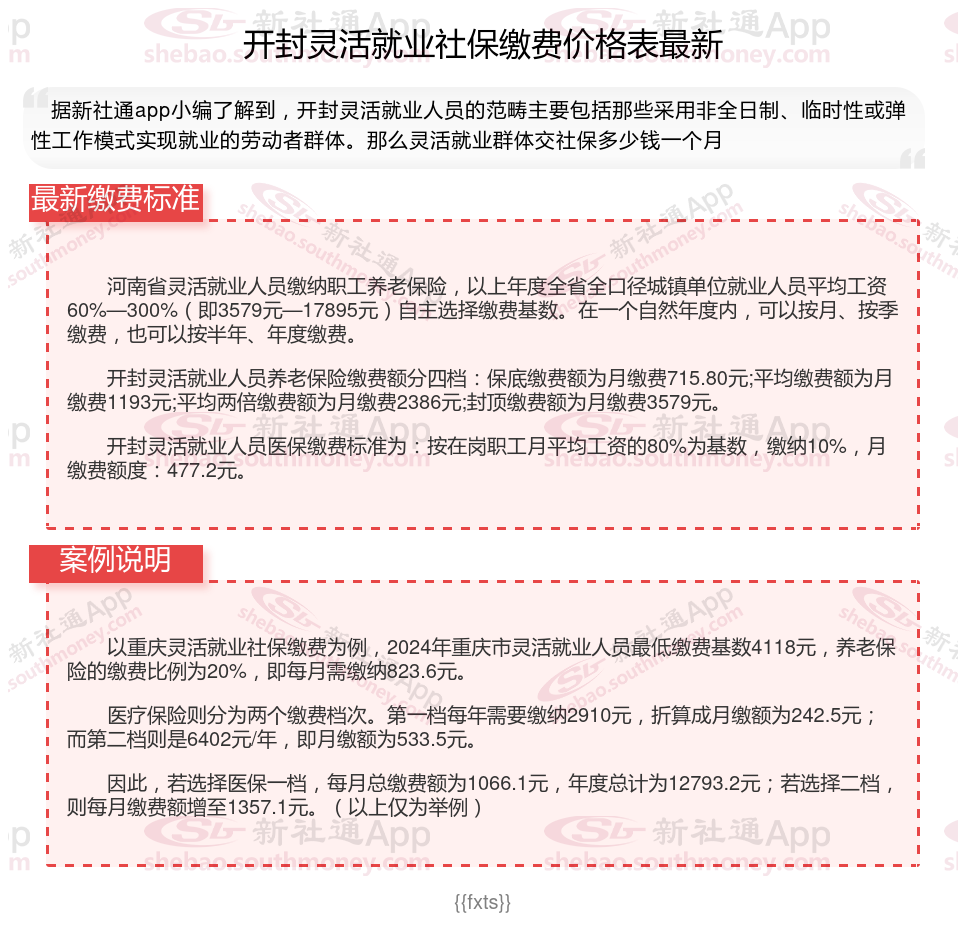 据新社通app数据显示,开封企业灵活就业养老保险的缴费基数为:3579元。