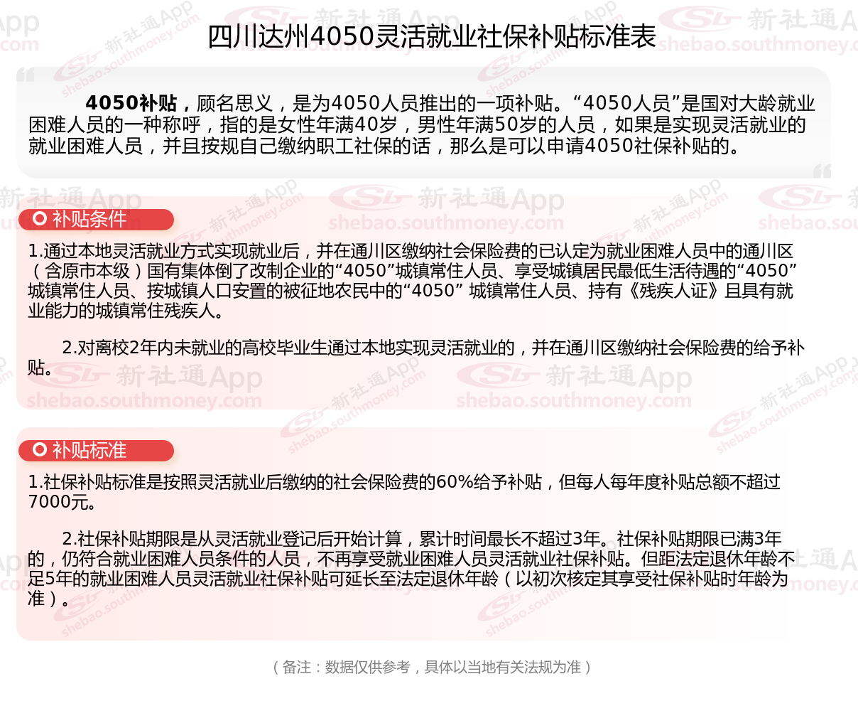 今天聊一下4050补贴话题。4050补贴听起来像是一个针对特定年龄人群的社保补贴。比如女性需年满40周岁,男性需年满50周岁(以申请当年12月31日为截止日期)。那么四川达州4050灵活就业社保补贴标准是多少钱?四川达州4050社保补贴条件是什么?接下来随新社通APP小编了解一下最新资讯。