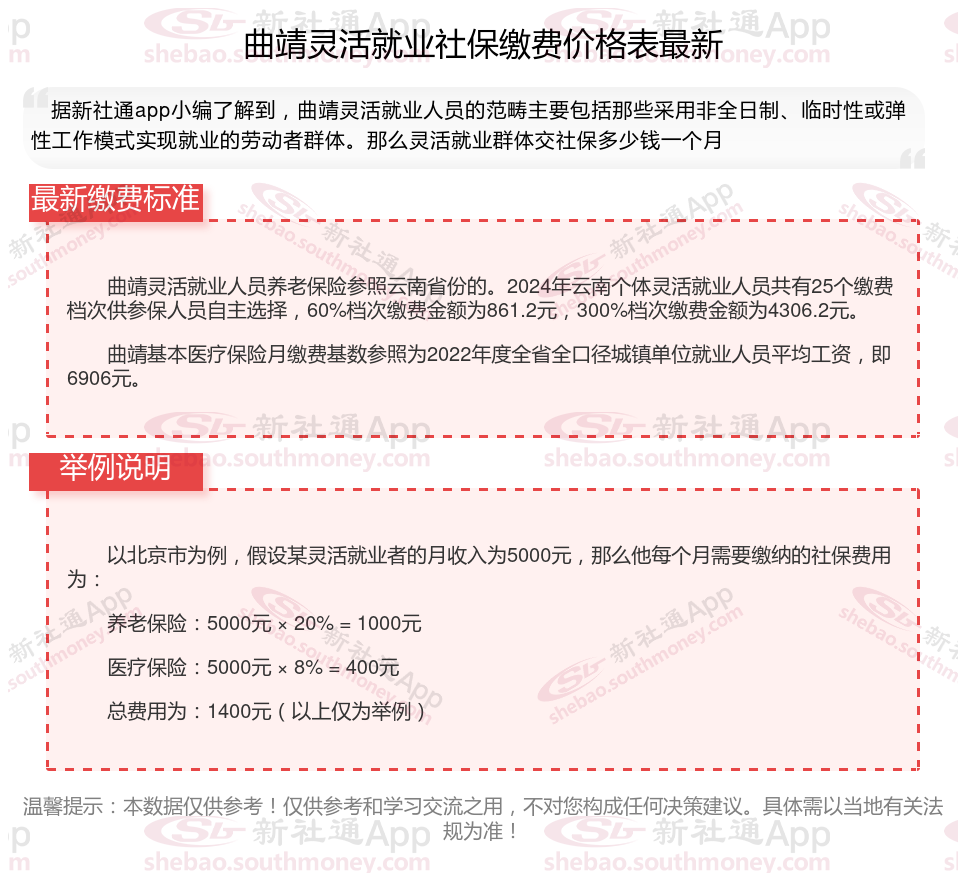曲靖灵活就业人员社保每月交多少钱?根据新社通app-社保缴费查询工具提供的最新数据如下: