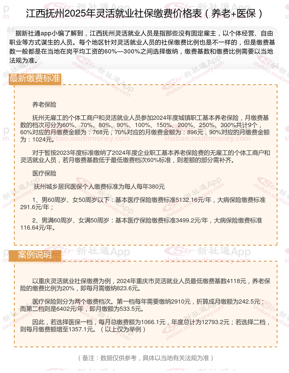 江西抚州灵活就业人员参保月缴费金额是多少?2024-2025年度江西抚州灵活就业人员社保缴费标准是多少?根据新社通app-社保缴费查询工具提供的2025社保缴费标准详情数据: