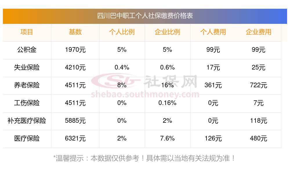 据新社通app小编了解到,2025年四川巴中社保缴费基数参照为3579.00,四川巴中社保缴费明细如下: