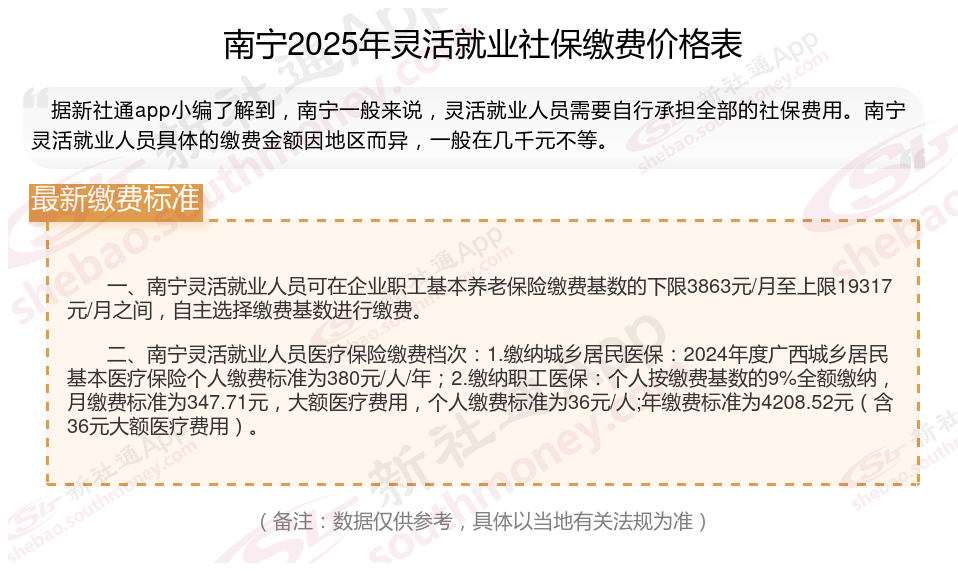 南宁社保缴费多少钱?下表是2024-2025年南宁社保费用明细参考,根据新社通app-社保缴费查询工具提供的最新数据如下: