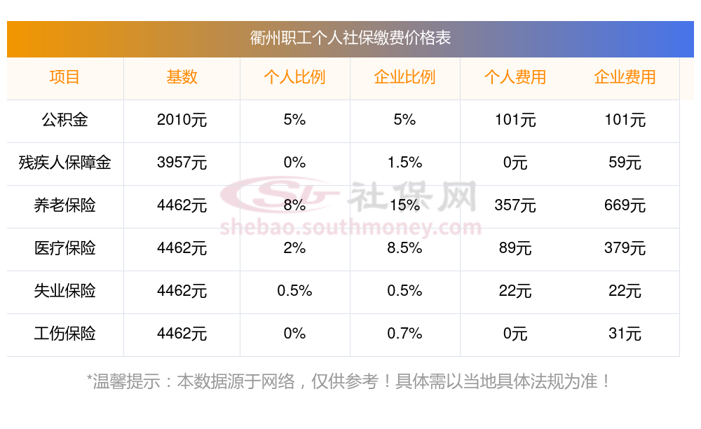 5、工伤保险缴费比例:根据单位所属行业风险程度实行差别费率0.5%-2%,个人不用缴费;