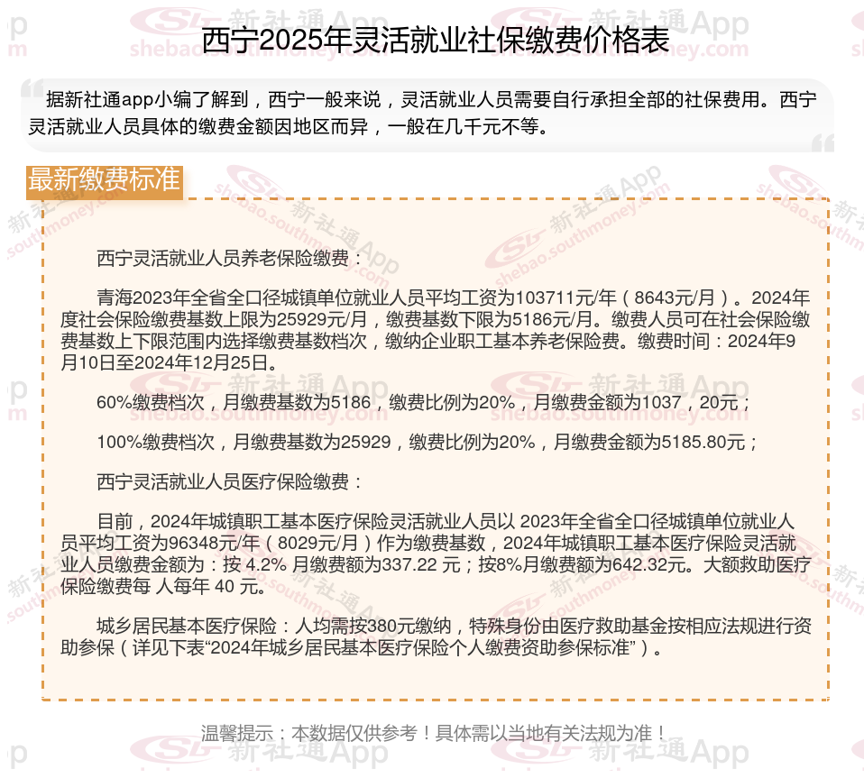 以上就是带来西宁灵活就业社保缴费标准相关知识,内容及数据仅供参考,希望对你有帮助,欢迎关注/下载新社通app解锁更多社保专业资讯。