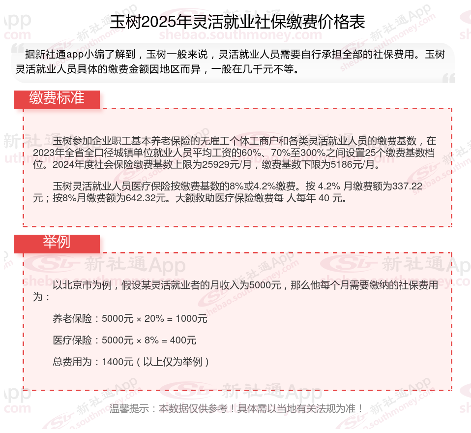 玉树参加企业职工基本养老保险的无雇工个体工商户和各类灵活就业人员的缴费基数,在2023年全省全口径城镇单位就业人员平均工资的60%、70%至300%之间设置25个缴费基数档位。2024年度社会保险缴费基数上限为25929元/月,缴费基数下限为5186元/月。