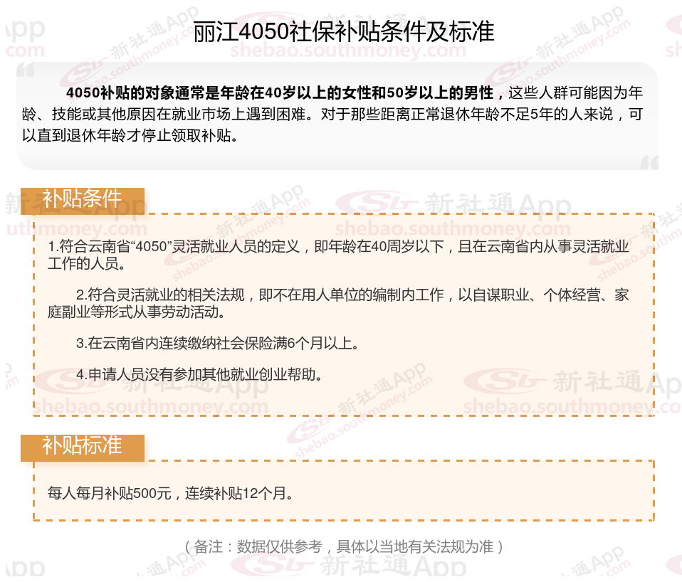 二、2025年丽江4050社保补贴标准及条件,最新如下: