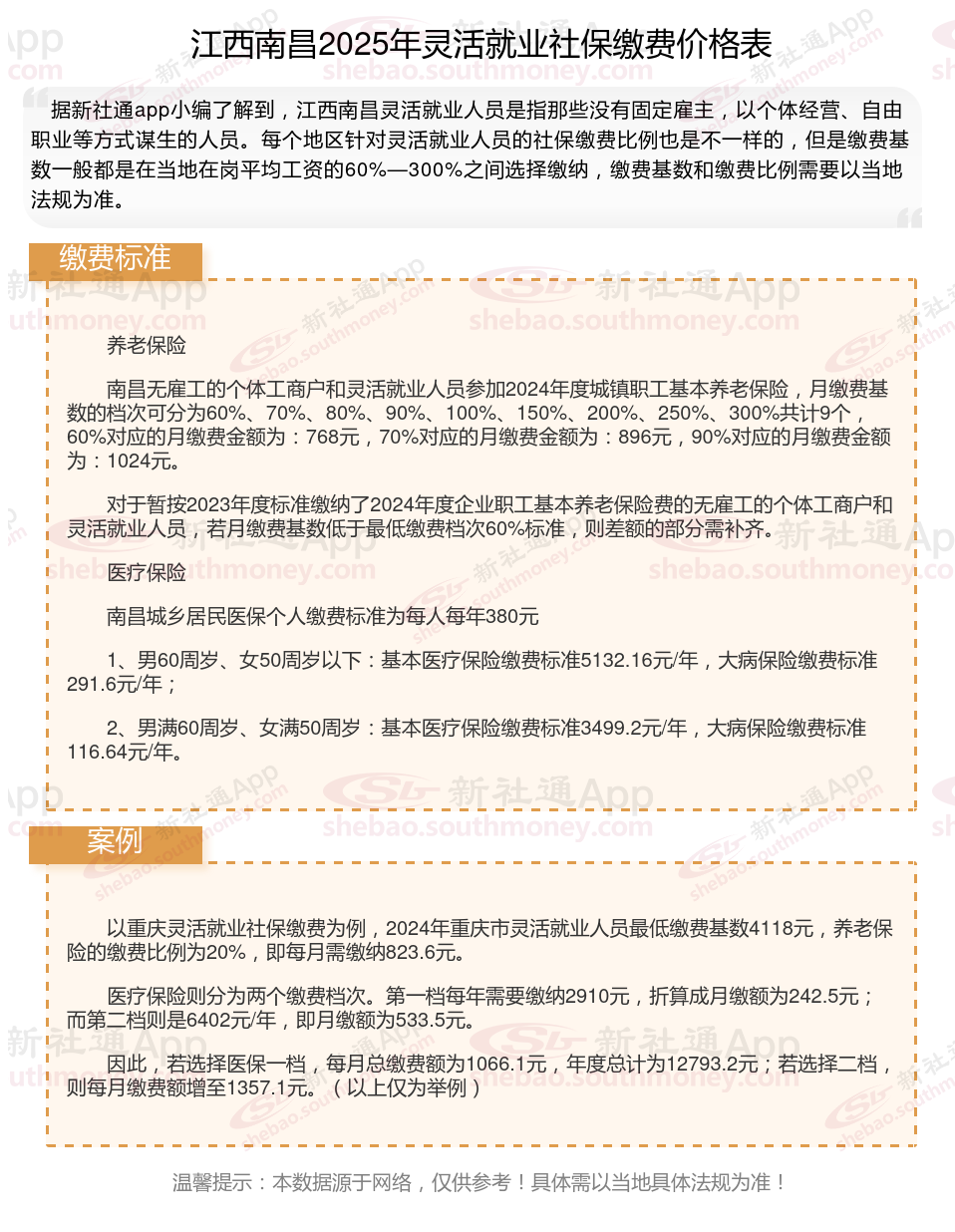 (2)江西南昌灵活就业社保参照职工社保的缴费基数进行缴纳。灵活就业社保由于各地区经济发展水平不一,职工月平均工资存在差异,所以各地区的社保缴费基数上下限也不同。
