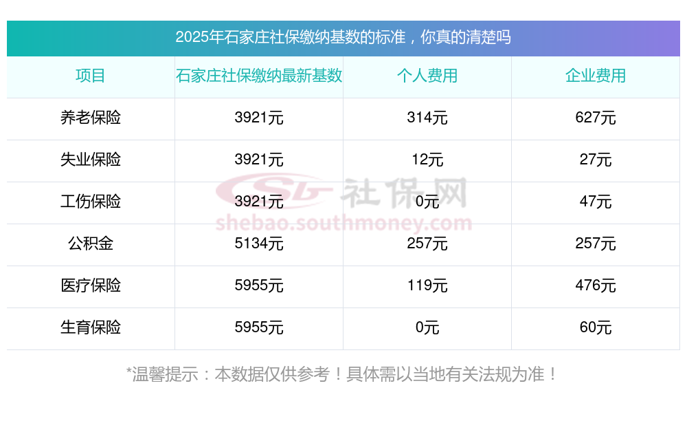 (1)据新社通app-查阅了解到,职工上一年1月至12月期间所有工资性收入所得的月平均额,用来确定社保基数,该基数用于计算社会保险费缴纳的工资基数。 目前该石家庄社保的缴费基数为:3920.55,个人费用约为:313.644元,企业费用约为:627.288元。