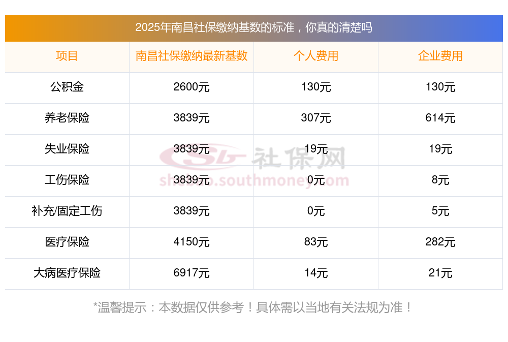 (1)据新社通小编了解到,社保缴费基数的确定主要依据职工上一年度的月平均工资,并结合当地社会平均工资的上下限(60%-300%)进行调整。 目前,南昌社保缴费基数为:3839.00,个人费用约为:307.12元,企业费用约为:614.24元。
