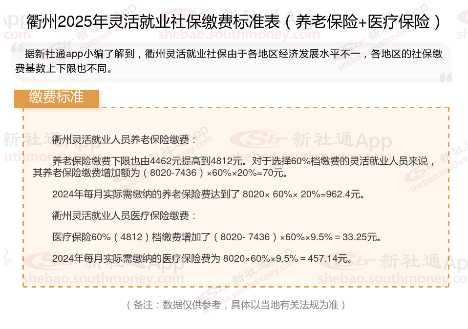2025衢州灵活就业社保缴纳基数是多少?衢州灵活就业人员社保交15年领多少?根据新社通app-社保缴费查询工具提供的2025社保缴费标准详情数据: