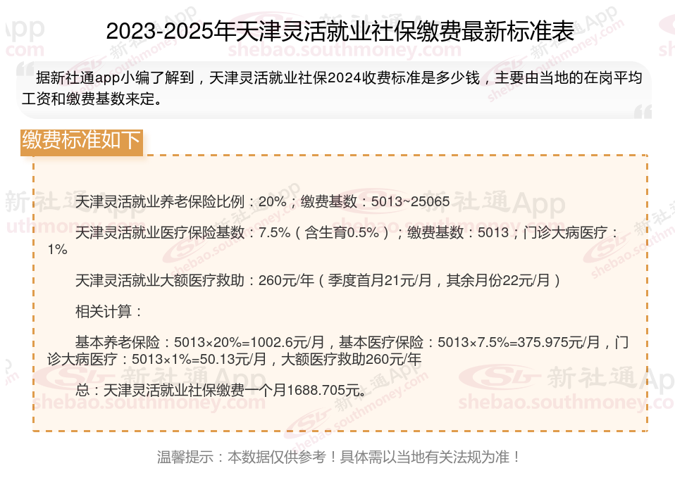 那么,天津灵活就业人员社保缴费基数最新标准,天津灵活就业社保多少钱一个月?根据新社通app-社保缴费查询工具提供的2025社保缴费标准详情数据: