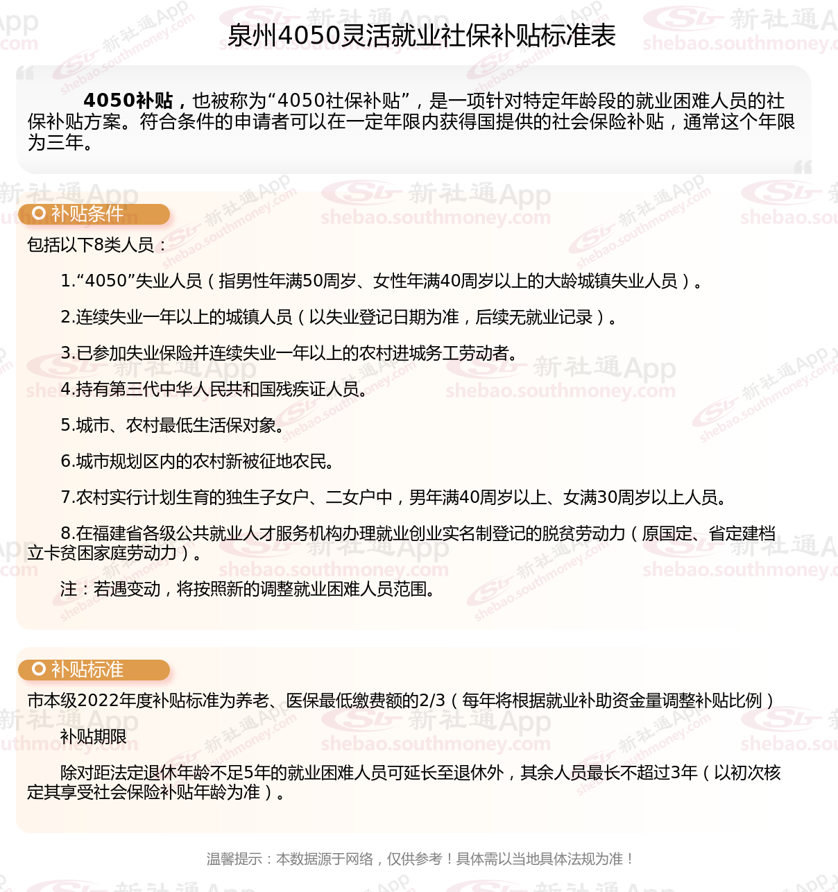 二、2025年泉州4050社保补贴标准及条件,最新如下:
