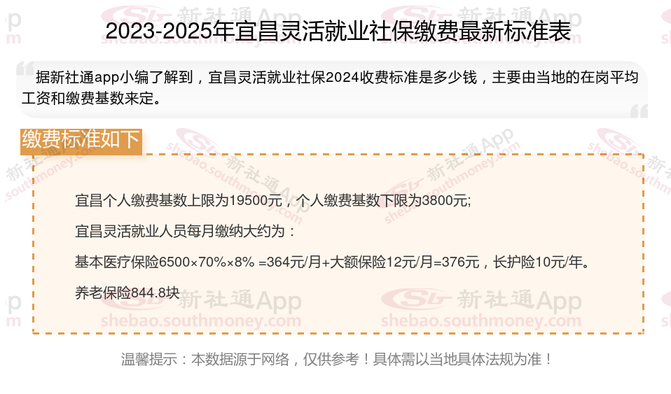 那么,宜昌灵活就业人员社保缴费基数最新标准,灵活就业人员自己交社保一个月得交多少钱?根据新社通app-社保缴费查询工具提供的2025社保缴费标准详情数据: