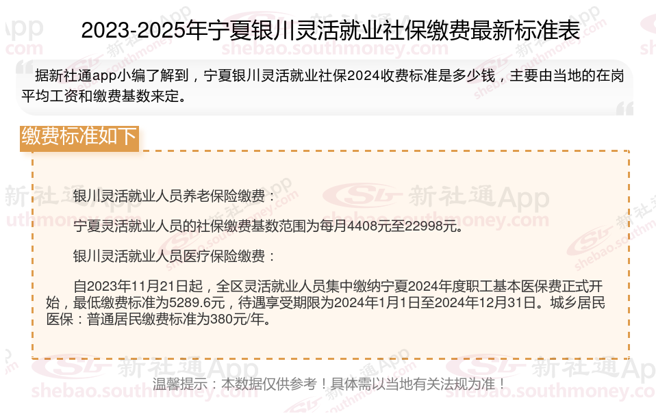 那么,宁夏银川灵活就业人员社保缴费基数最新标准,宁夏银川灵活就业社保多少钱一个月?根据新社通app-社保缴费查询工具提供的2025社保缴费标准详情数据:
