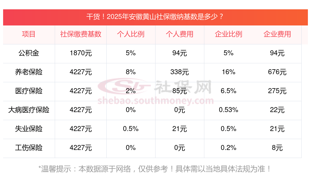 社保基数的确定,依据职工上一年1月到12月期间,所有工资性收入所得的月平均金额,此金额用于计算社会保险费缴纳的工资基数。那么,2025年安徽黄山社保要交多少钱(缴费比例+缴费基数),下面随新社通app小编一起来了解具体内容。