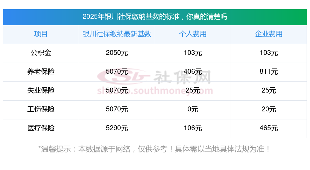 (1)据新社通小编了解到,社保缴费基数的确定,主要基于职工上一年度月平均工资,并结合当地社会平均工资60%-300%的上下限进行调整。 目前,银川社保缴费基数为:5070.00,个人费用约为:405.6元,企业费用约为:811.2元。