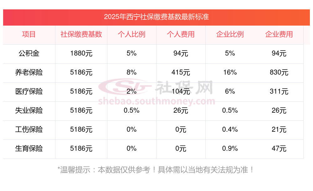 (1)据新社通app-查阅了解到,用于计算社保费缴纳工资基数的社保基数,其确定依据为职工上一年度1月至12月所有工资性收入所得的月平均额。 目前该西宁社保的缴费基数为:5186.00,个人费用约为:414.88元,企业费用约为:829.76元。