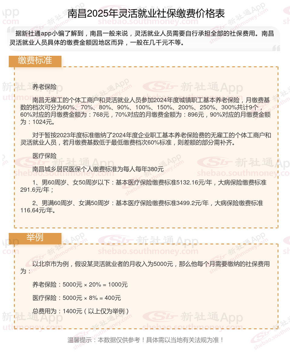 那么,南昌灵活就业人员社保缴费基数最新标准,南昌灵活就业社保多少钱一个月?根据新社通app-社保缴费查询工具提供的2025社保缴费标准详情数据: