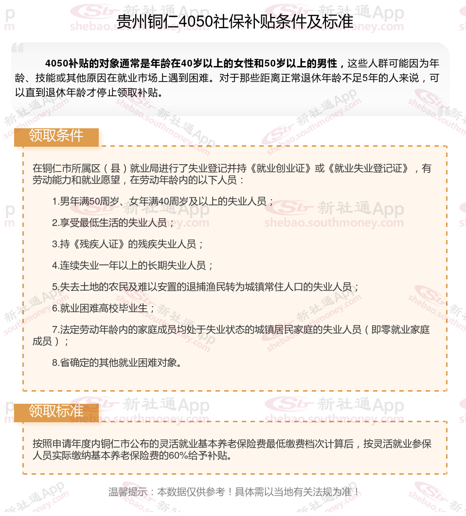 二、2025年贵州铜仁4050社保补贴标准及条件,最新如下: