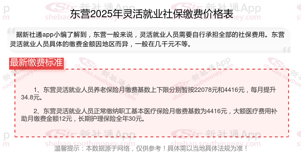 据新社通app显示,东营灵活就业人员养老缴费基数2024-2025年最新标准如下: