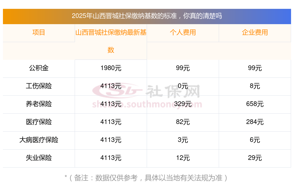 2025年社保缴费价目表,下面和新社APP一起来了解下2024-2025年山西晋城最低配社保费用明细参考,新社通app-社保缴费查询工具提供的最新数据如下: