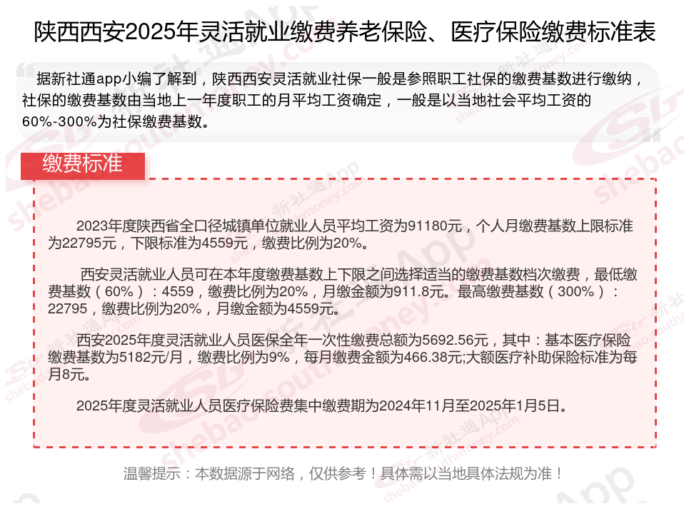 据新社通app显示,陕西西安灵活就业人员养老缴费基数2024-2025年最新标准如下:
